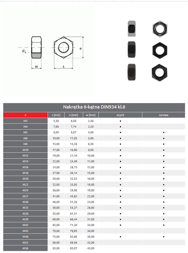 Nakrętki sześciokątne DIN 934 wykonane ze stali niskowęglowej oraz posiadają powłokę antykorozyjną w postaci ocynku galwanicznego. Mają bardzo obszerne zastosowanie zarówno w przemyśle jak i budownictwie, przy różnego rodzaju konstrukcjach stalowych, przy budowie maszyn, a także w branży automotive.