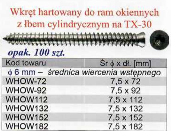 Wkręty hartowane do ościeżnic wykorzystywane są do mocowania ościeżnic okiennych i drzwiowych, profili okiennych z drewna, metalu, tworzyw sztucznych, ram okiennych i drzwiowych, uchwytów mocujących. Materiał wykonania to stal ocynkowana galwanicznie. Przeznaczony jest do betonu, kamienia naturalnego, cegły pełnej, pustaków szczelinowych, cegieł kratowych.